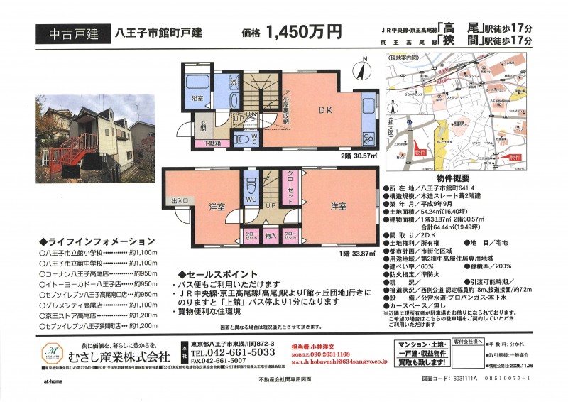 ■JR中央線「八王子」駅 バス25分 「新川口」バス停 徒歩5分 ●ライフインフォメーション ・からまつ保育園・・・・・・・750m ・共励第二こども幼稚園・・・1, 520m ・松枝小学校・・・・・・・・1, 120m ・川口中学校・・・・・・・・1, 440m ・エコス川口店・・・・・・・・600m