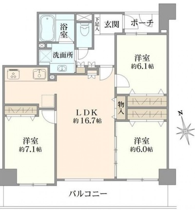 LDK約16.7帖、洋室約7.1帖、洋室約6.1帖、洋室約6.0帖