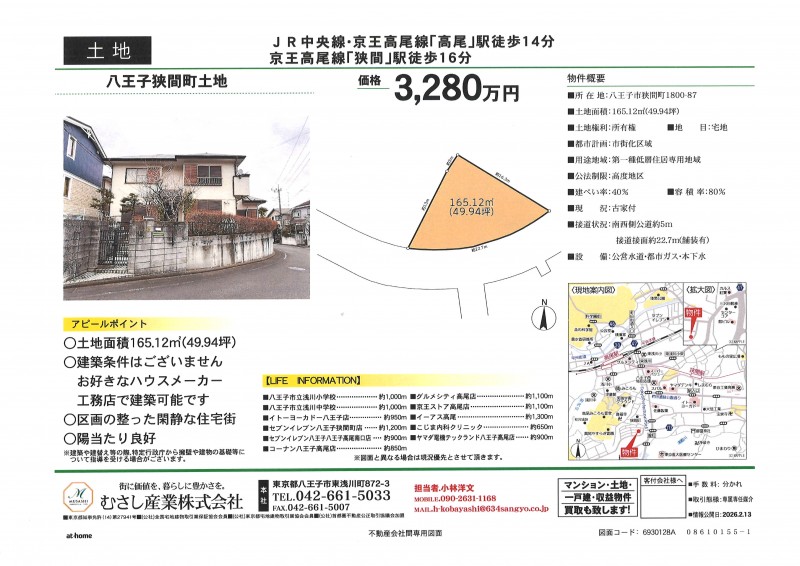 ■土地面積165.12㎡(49.94坪) ■建築条件はございません ■お好きなハウスメーカー・工務店で建築可能です ■区画の整った閑静な住宅街 ■緑豊かな住環境 ■陽当たり良好 ~ライフインフォメーション~ ・八王子市立浅川小学校・・・約1,000m ・八王子市立浅川中学校・・・約1,000m ・コーナン八王子高尾店・・・約850m ・セブンイレブン八王子高尾南口店・・・約900m ・イトーヨーカドー八王子店・・・約950m ・グルメシティ高尾店・・・約1,100m ・京王ストア高尾店・・・約1,100m ・セブンイレブン八王子狭間町店・・・約1,200m ・イーアス高尾・・・約1,300m ・こじま内科クリニック・・・約650m ・ヤマダ電機テックランド八王子高尾店・・・約900m